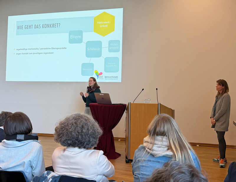 Die Maßnahme „Ich-schaff-das“ der Lernwerkstatt und des Jugendamtes der Stadt Regensburg wird in Zusammenarbeit mit der Jakob-Muth-Schule angeboten. In ihrem Vortrag präsentierten sie das Konzept, das Jugendlichen mit massiven Schulbesuchsschwierigkeiten wieder Struktur, Selbstvertrauen und Anschluss an den Unterricht ermöglicht.